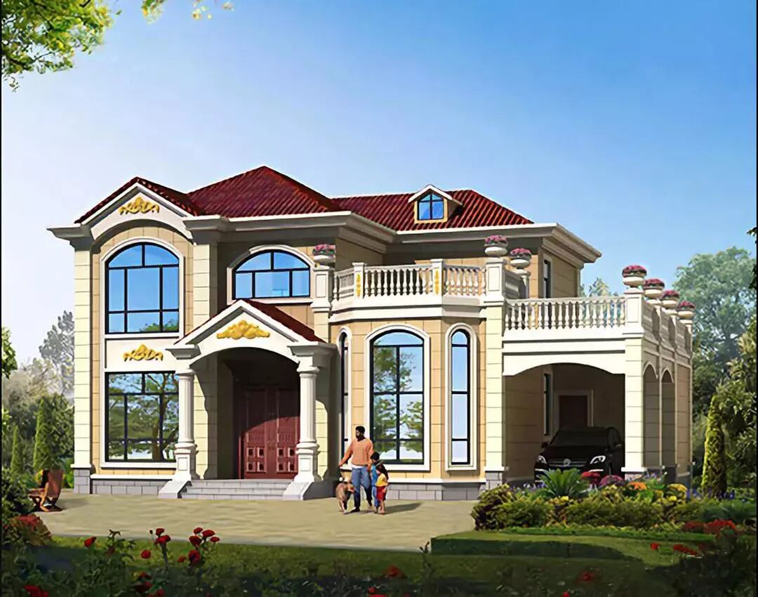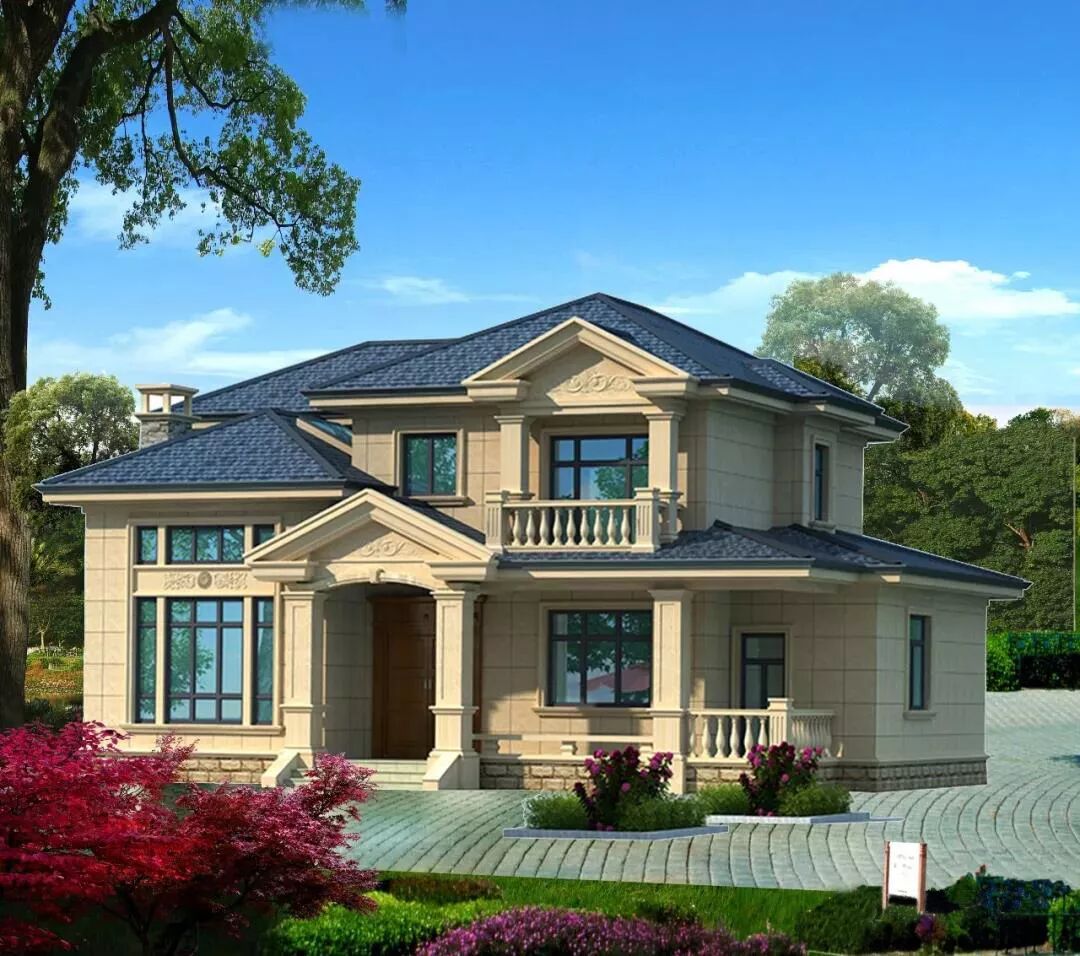 建筑面积:227㎡ 主体结构:装配式钢结构 功能布局: 一层设有:门廊、门厅、棋牌室、卧室、卫生间; 二层设有:4间卧室、3间卫生间、衣帽间和露台。