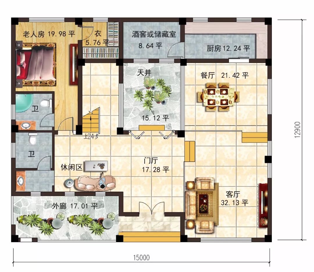 一层设有门厅、休闲区、客厅、餐厅、老人房(带有独立卫生间)、酒窖和天井;