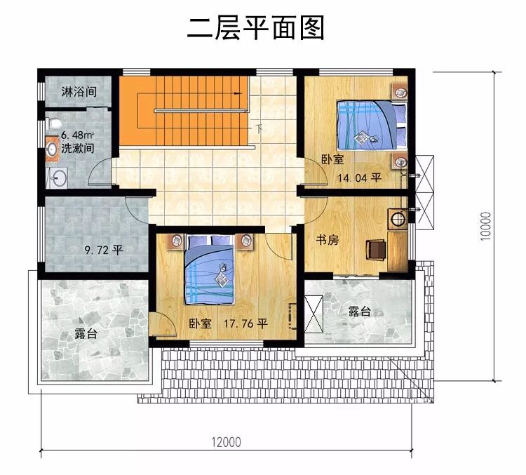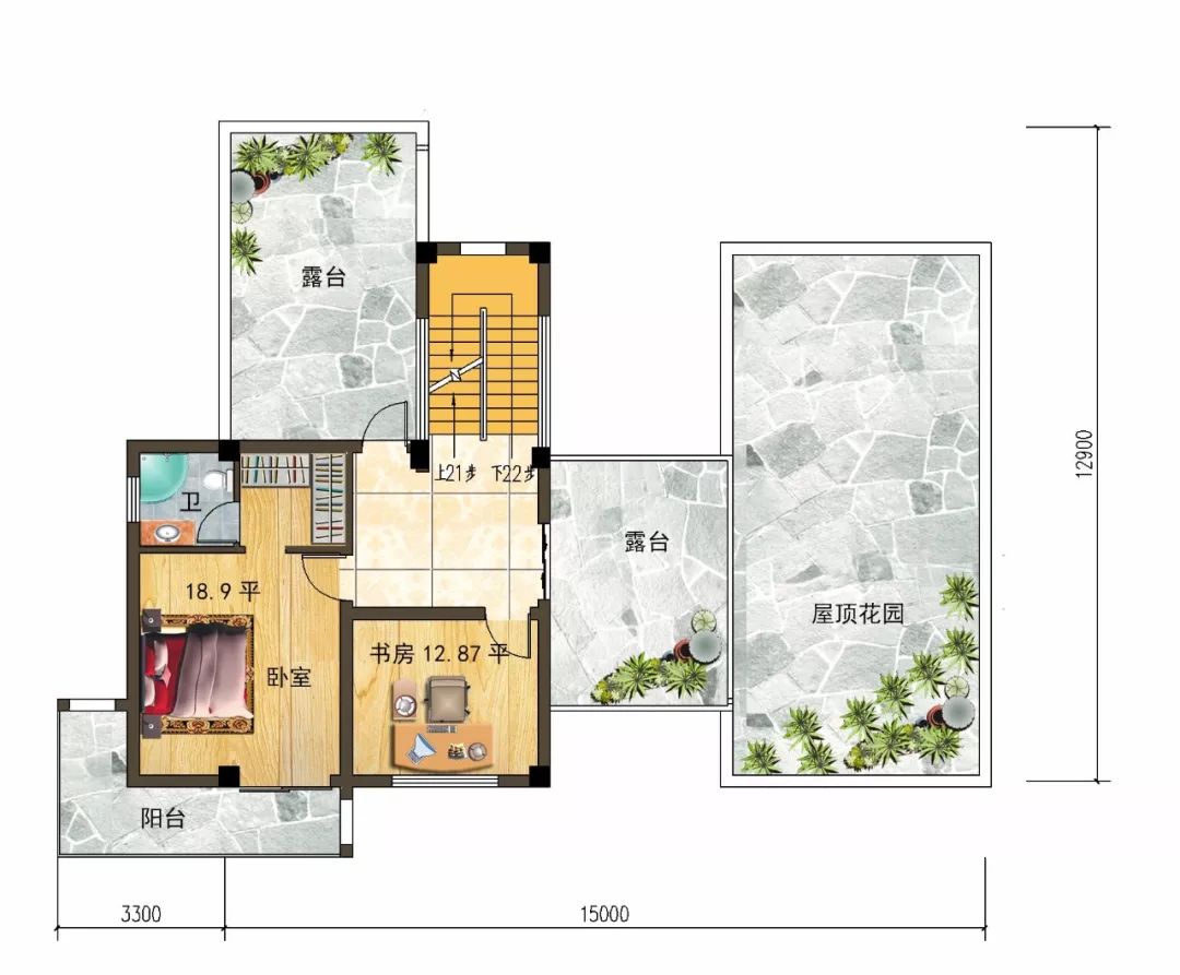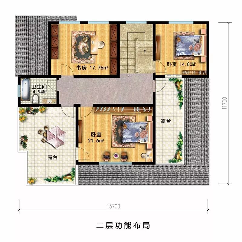 二楼设有2个卧室、2个卫生间、书房和露台。