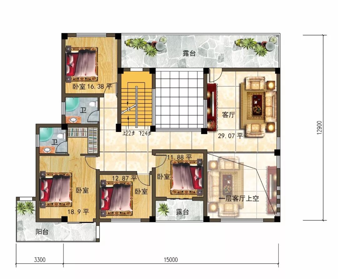 二楼设有客厅,3间卧室、2个卫生间、1个阳台和1个露台;