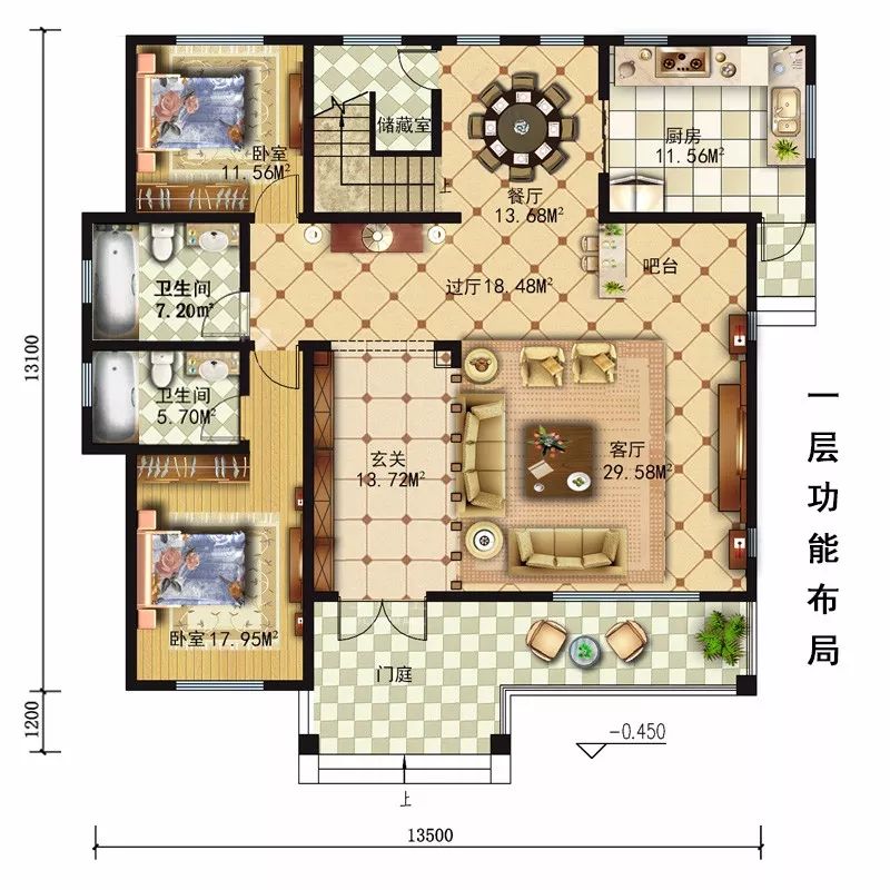 一层设有玄关、厨房、餐厅、吧台、2卧室、2卫生间和储藏室;