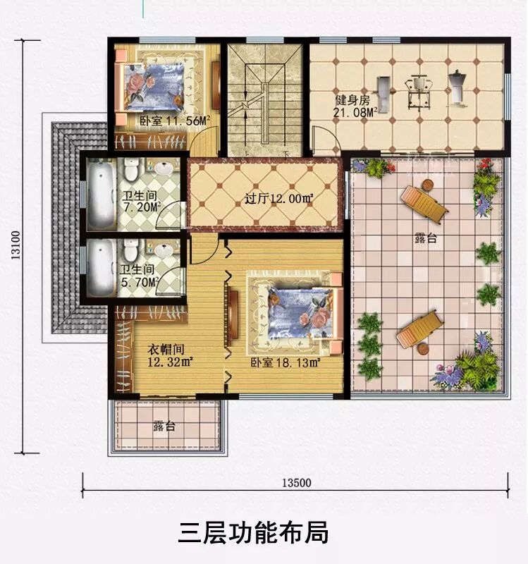 三楼设有2卧室、2个卫生间、衣帽间、健身房和2个露台。
