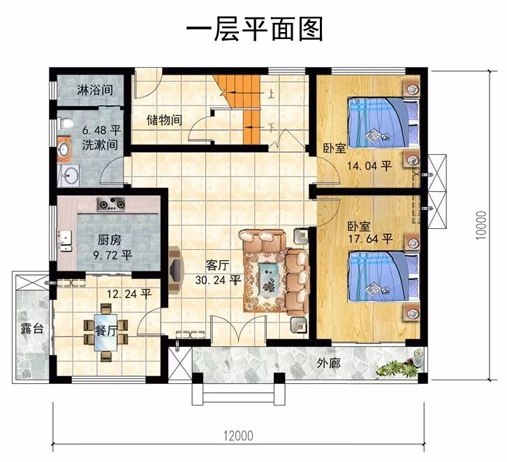 一层设有门廊、客厅、餐厅、厨房、卫生间、储物间和2个卧室;