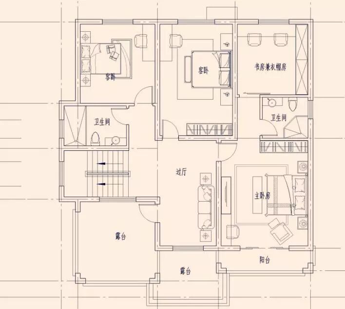 温馨大气的一款农村小别墅,进门可以设计堂屋神位,一楼有二间卧室,二楼有4间卧室,衣帽间书房齐全。户型开间12.2米,进深13.5米,占地面积162平方米。