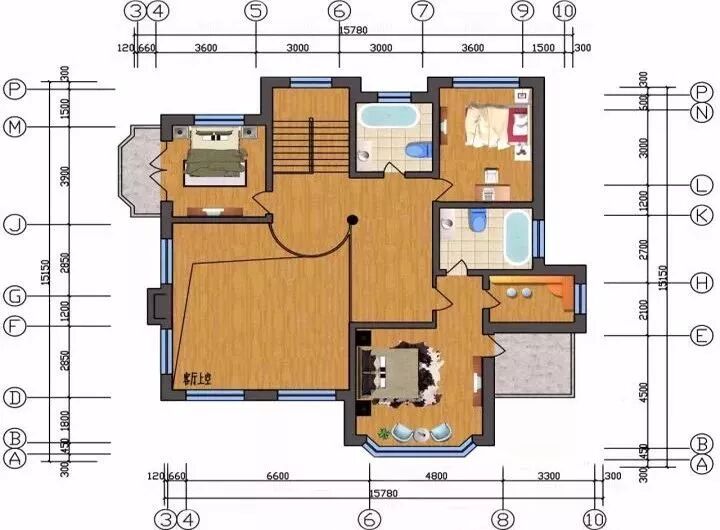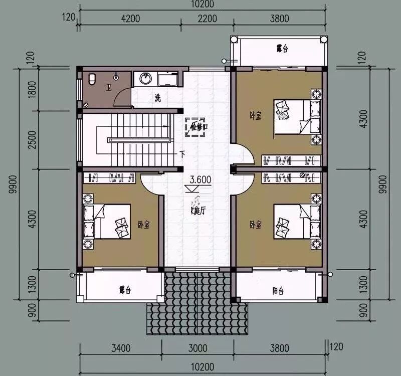 二层功能布局:3间卧室、2间卫生间、衣帽间、露台。