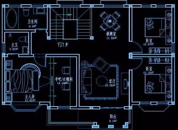 二层功能布局:3间卧室、家庭室、书房、卫生间、露台。