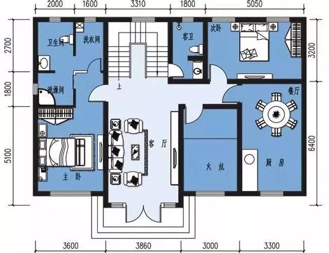一层功能布局:2室2厅1厨2卫,洗衣间;