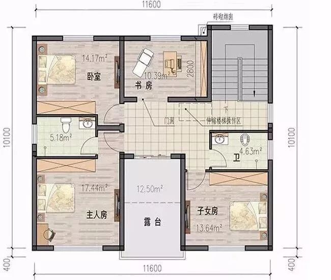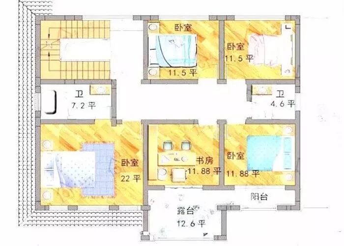 二层功能布局:书房、三间卧室、三间卫生间、一个露台。