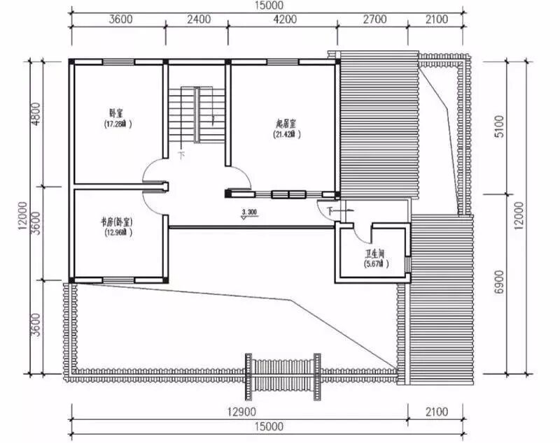 二层功能布局:起居室、卧室、书房(卧室)、卫生间。