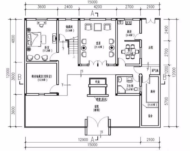 一层功能布局:前院、中庭、堂屋、饭厅、厨房、卧室、粮食储藏室(客卧室)、储藏间、卫生间、禽畜舍、后院;
