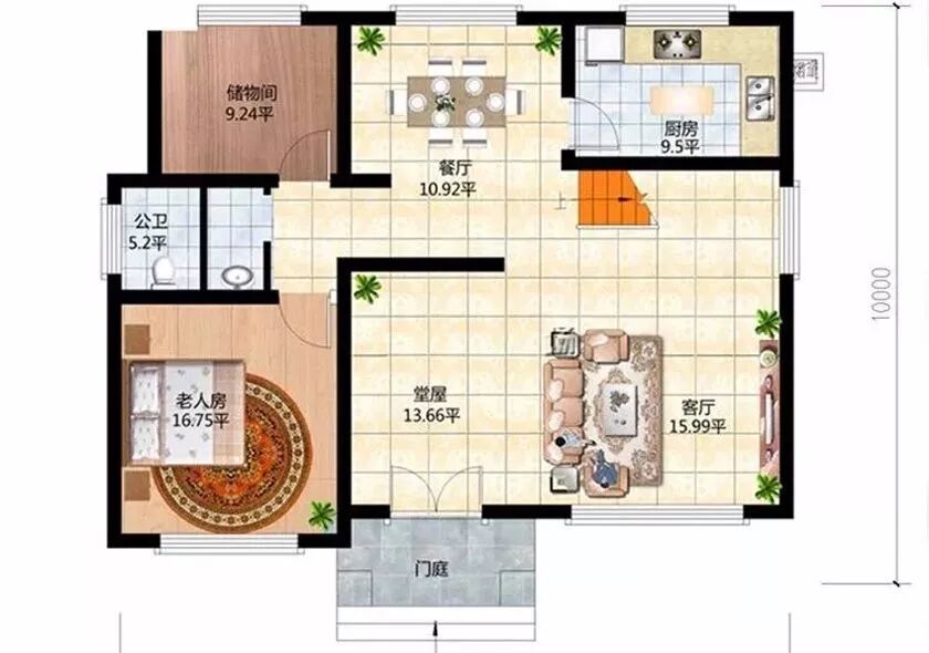一层功能布局:堂屋、客厅、餐厅、厨房、老人房、卫生间、储藏室;