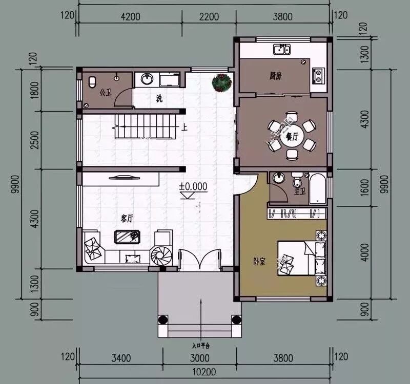 一层功能布局:客厅、餐厅、厨房、卧室(带独立卫生间)、公卫;