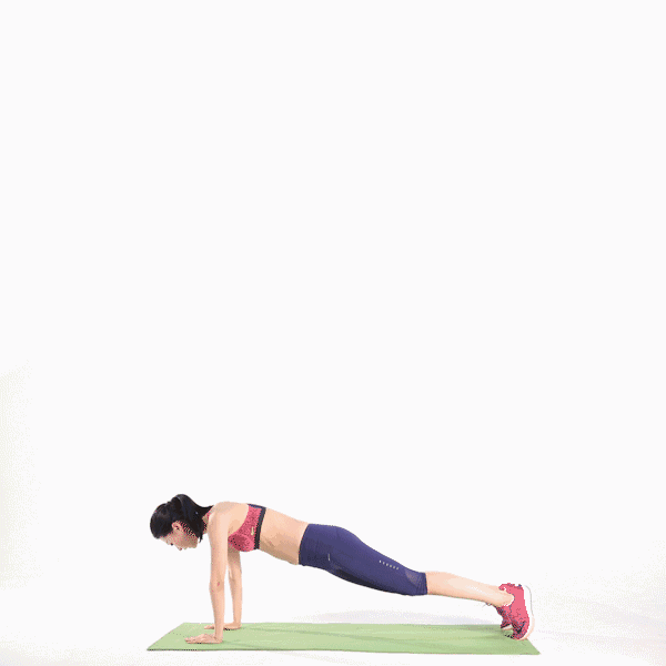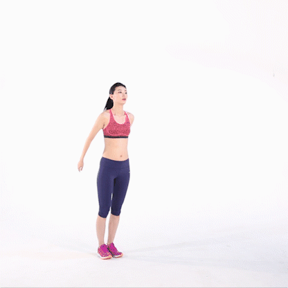 双膝并拢,脚尖朝天花板方向,手臂放身体两侧,保持挺胸收腹,肩膀下沉,下额微收,吐气向上,吸气还原,重复动作做45秒,之后休息15秒。
