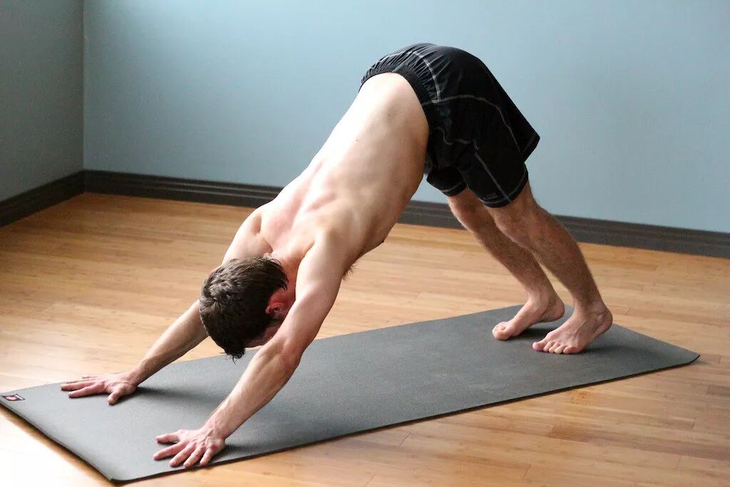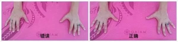在下犬式中,双手十指尽可能张大,掌跟贴地,虎口压实,中指指向正前方,大拇指尽可能向中线靠拢。