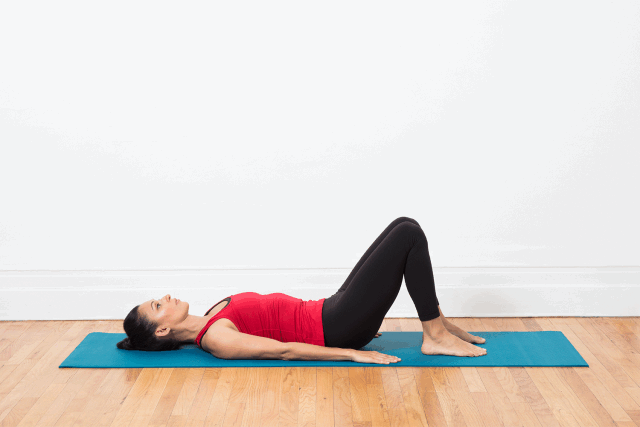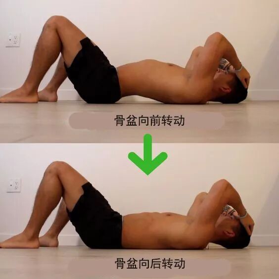 仰卧在垫面上,屈双膝,双手放在身体的两侧,提耻骨向上,髂骨向后找地面,然后还原,重复练习骨盆向后转动20-30次,然后,在做相反的练习,骨盆向前转动20-30次。