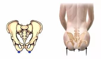 其中,瑜伽老师提到比较多的一个是骨盆前侧靠近我们会阴处的耻骨(耻骨联合),一个是臀部下方的坐在地上的硬硬的坐骨(图2),尾骨也是经常会被提到的一个部位,初学者伽人一定要知道在哪里哦!