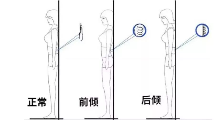最简单直接的办法,就是靠墙站立,双脚与双肩贴墙,检查腰部与墙壁的距离,如果大于一个手掌的厚度,那就可能是骨盆前倾了。
