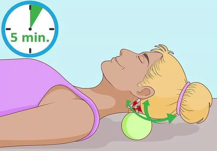 利用网球按摩头部后侧颈部肌肉附着点,放松颈部肌肉,此外也可以让同伴或者专业的理疗师徒手按摩颈部肌肉,帮助松解僵硬的肌肉和筋膜组织。