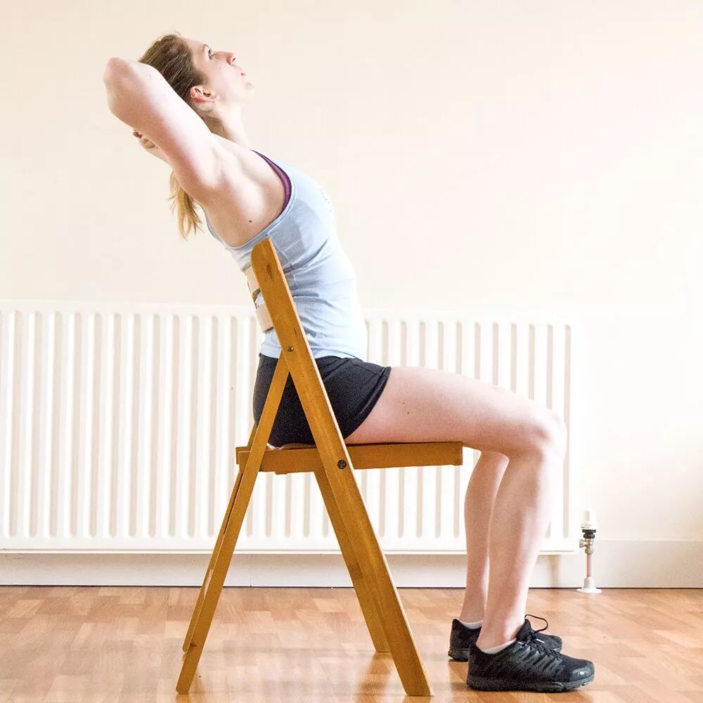 坐立在瑜伽椅上,双手抱头部的后侧