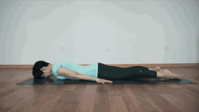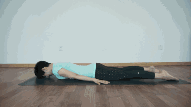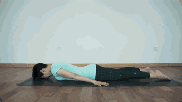 1、俯卧,双手臂向后方伸展,在背后十指交叉,双手掌心紧握在一起,把肩胛骨向中间夹;