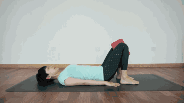 2、吸气,臀部向上抬高,到达自己的极限位置,双膝保持骨盆的宽度,也可以像图中老师那样夹一块瑜伽砖;
