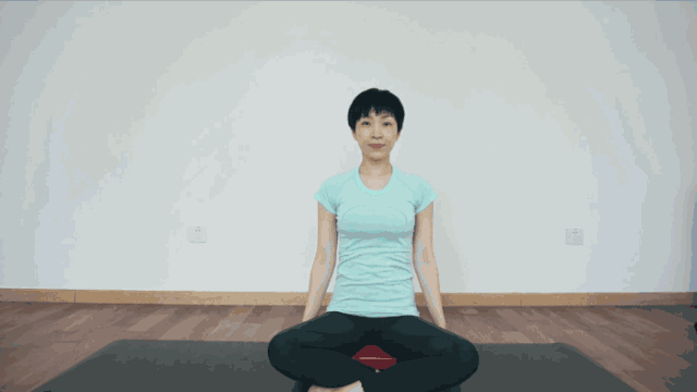 1、交叉盘坐,吸气,双手向上举高过头顶,十指交叉,翻转掌心向上推向天花板;