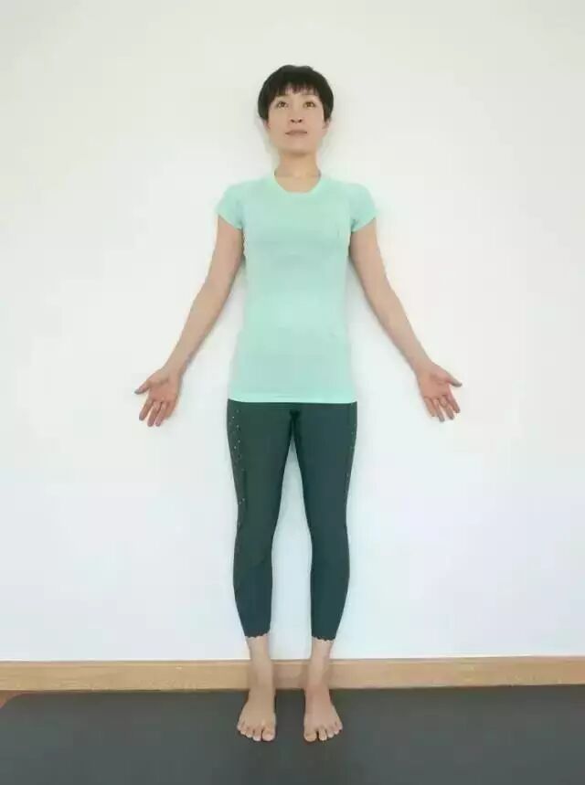 背靠墙壁,双脚分开与骨盆同宽,双脚外侧相互平行,脚跟离开墙壁约5厘米,让头、双肩、胸椎、臀部紧紧的贴在墙壁上。双手掌心向外也紧贴墙壁。保持5分钟。