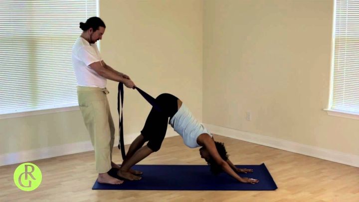 这样的辅助,可以让伽人找到下犬式中脊柱延展,双手臂推,坐骨向后向上的感觉。