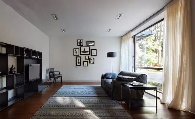 大面积户型选择深色木地板。因为深色给人视觉收缩。大户型的空间本来就比较空旷,需要渗色木地板来一个视觉聚焦。