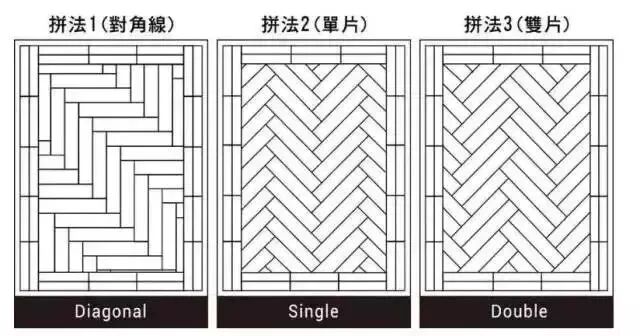 就是将木板依照“人”字一块一块地拼接起来。这种铺法在视觉会给人很好的感觉。人字形铺法可以细分为三类,分别是:分别是直平人字形、斜人字形、双人字形(下图)。