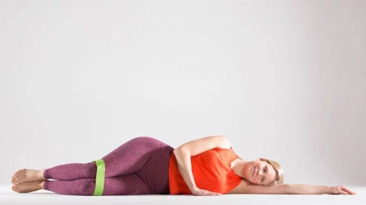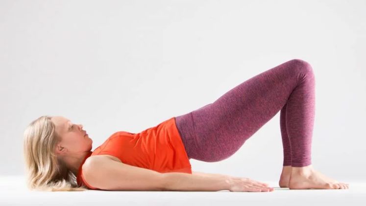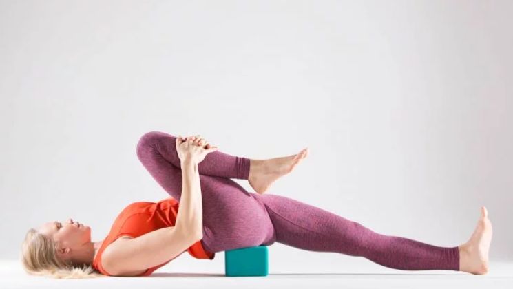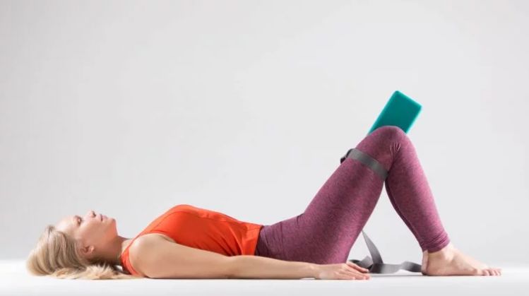 仰卧在垫面上,骶骨下方垫瑜伽砖