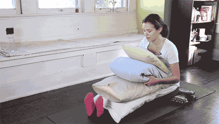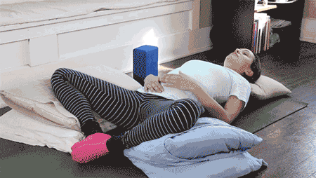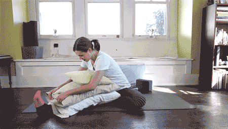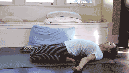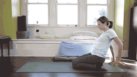跪姿,双腿自然分开,把枕头放在大腿中间,整个上半身趴下,就像婴儿趴睡般,自然呼吸。头转向左方,几个呼吸后,头转向另一侧。