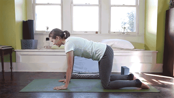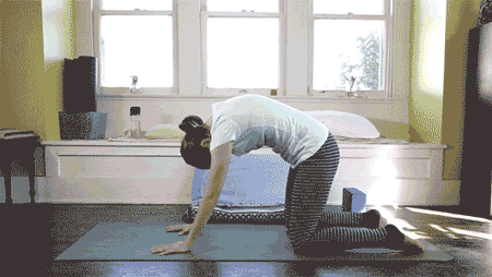 四足跪姿预备,此时背部呈水平,延展脊柱,慢慢地呼气,拱起整个背部,头下垂,下巴向锁骨收,臀部内收,保持姿势1-2秒。