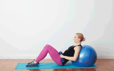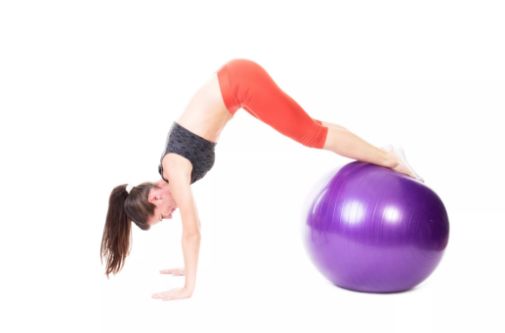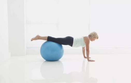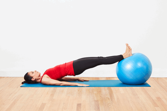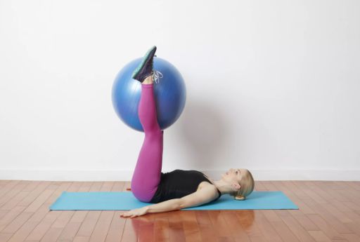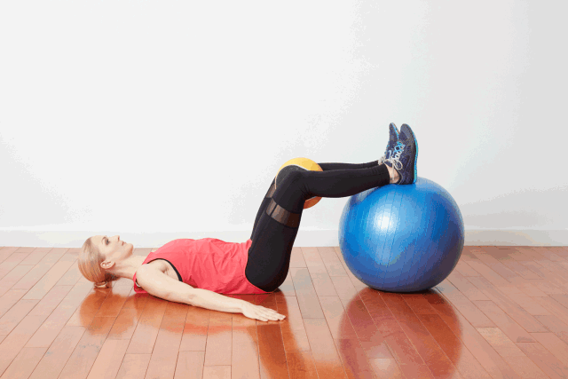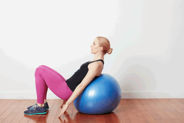 仰卧在瑜伽球上,双腿分开与髋同宽