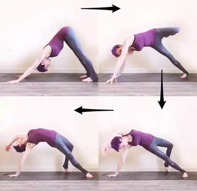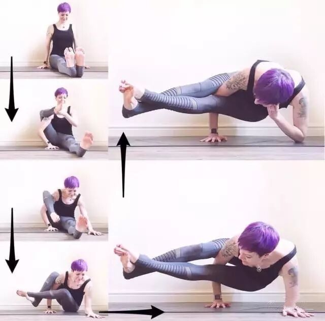 从侧乌鸦式开始,然后左腿向前伸直,右腿向后伸直。