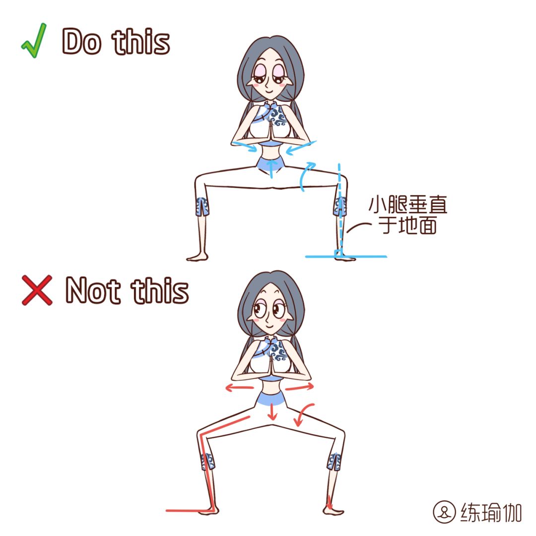 ▲大腿向上延展拉伸,臀部在脚踝正上方,向头顶方向延展脊柱,脖子放松。