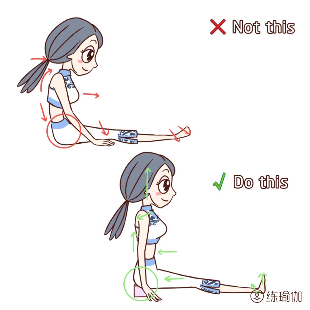 ▲双脚并拢伸展,双脚脚尖回勾,大腿下压,尾骨垂直于地面(可以借助瑜伽砖),会阴头顶一条线。
