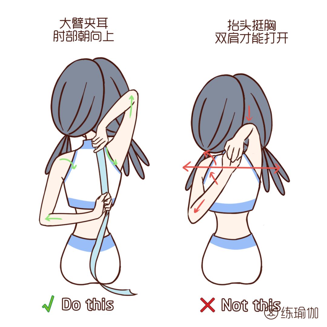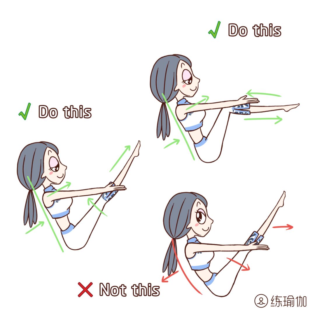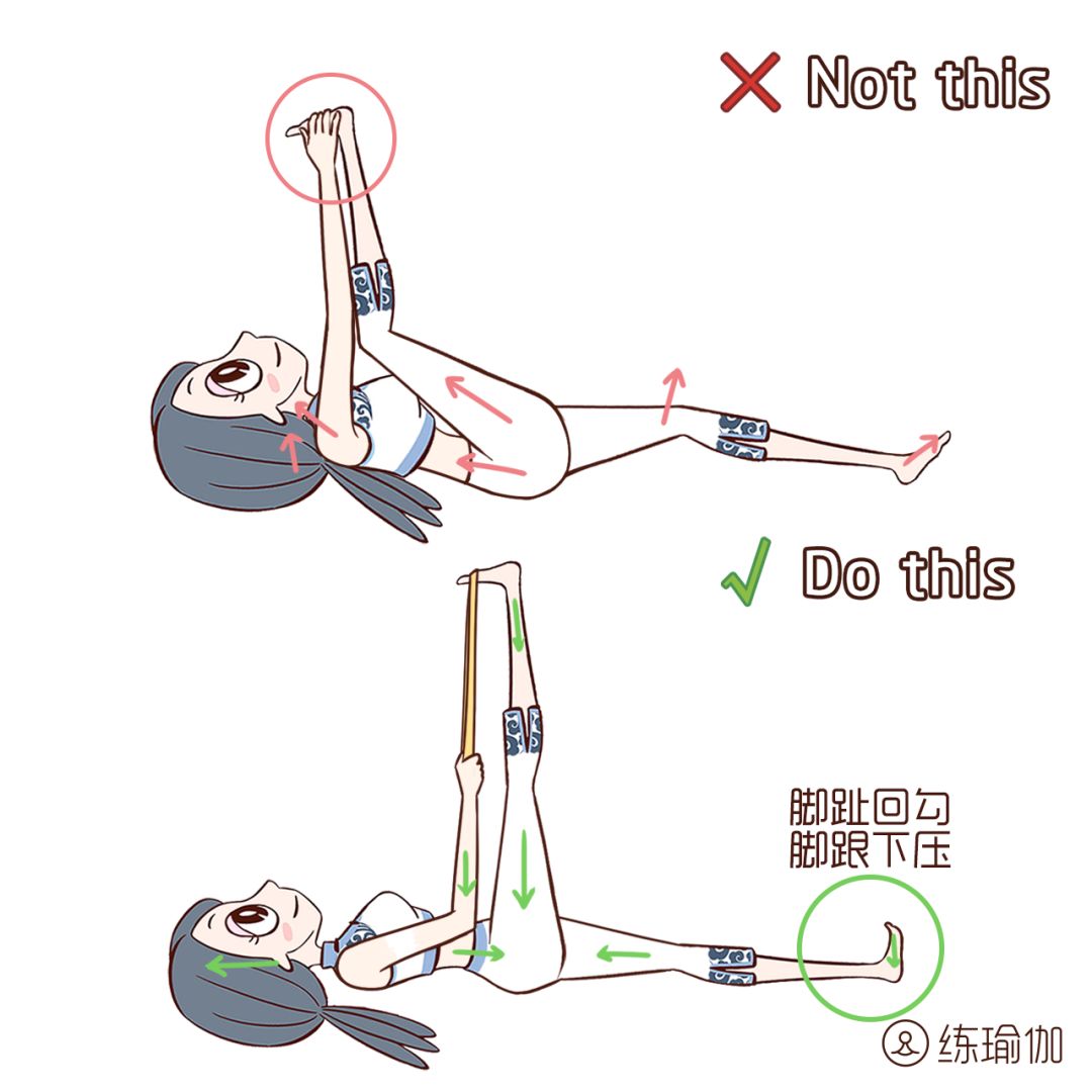 ▲下方腿伸直下压脚尖回勾,上方腿大腿前侧要向大腿后侧推,并且借助瑜伽带是向下用力的哦,腿伸直比手伸直更重要!