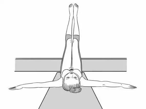 平躺在床上,双腿并拢搭在墙壁上,双手平展在身体两侧,保持5至10分钟。这个体式可以把气血引到头部来滋养大脑细胞,从而改善脑供血、消除大脑疲劳。