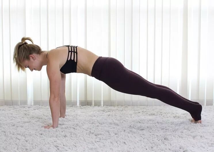 呼气收腹,双手推地、伸直手臂