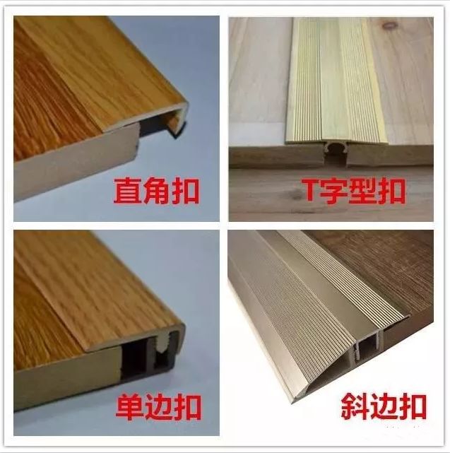 扣条即是压条,它有很多形状,除了以上图片的四种外当然还有其他,比如U型扣条等,它主要是用来衔接两种材料或者不同材料的交接处,扣条的作用一是为了装饰,二是因为材料之间的膨胀系数不同,所以需要留一些缝隙,而压条正好可以把这个缝隙处理好,除了第一点它可以美观这个缝隙外,也可以给材料之间提供余量;