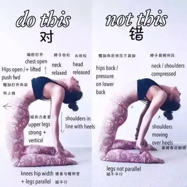 体式要点:不要只依赖柔韧性去做这个体式,否则会以腰部和挤压腰椎来代偿,上下背部都应该发力并伸展。腹股沟向后推,小腹、肋骨依次内收,喉咙内收向后。双肩后展,胸腔上提,背部发力,肩胛骨内收向下。