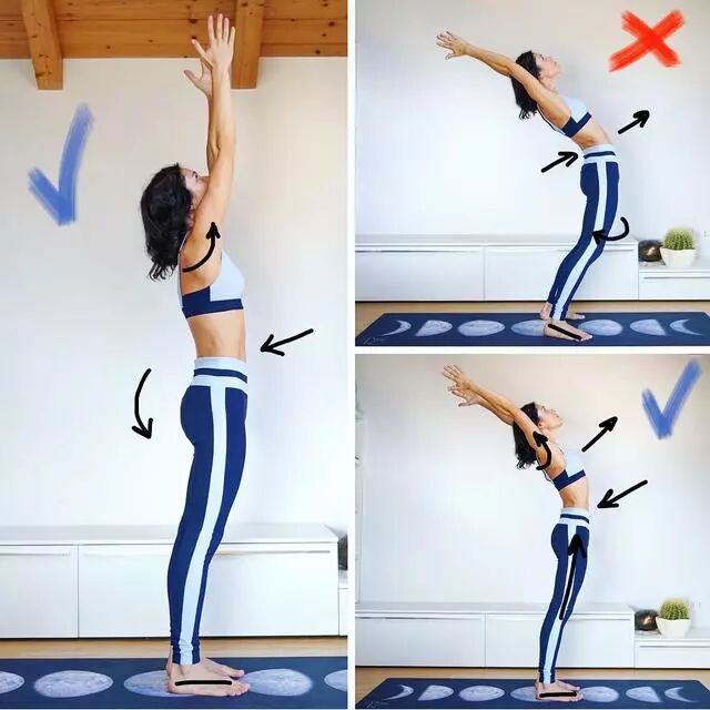 练习者双腿并拢伸直,脚掌紧贴地面,抬头挺胸,双手上举,掌心相向,颈部微微上仰,收紧腹部,上半身向后弯曲,注意胸椎上提,后弯的时候腹部收紧不要向前凸出,双腿保持笔直,脚掌贴地不要踮起,髋部向前方推,尾椎骨内收,整个人保持挺直状态。