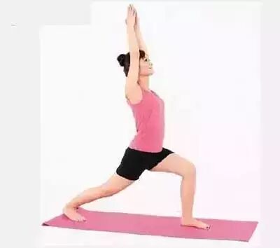 step2 将左脚屈曲成90,右脚则尽量拉后,双手合掌并向天伸直,注意保持姿势,并停留5-10秒,然后换另一边再重复整套动作。