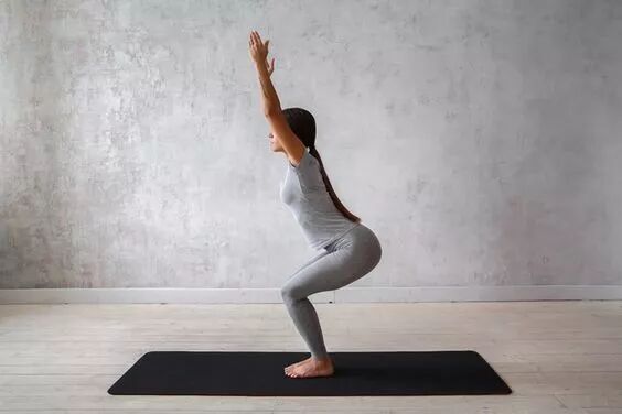 呼气屈髋屈膝,膝盖不要超过脚尖