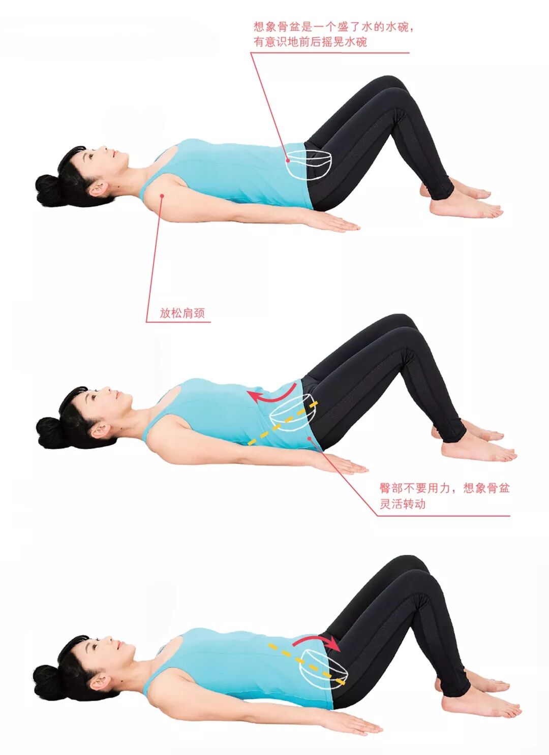 把骨盆引导至正确位置,有腹部减脂的效果。想象骨盆是一个盛了水的水碗,慢慢前后晃动水碗,让盆底肌肉向肚脐方向抬起。