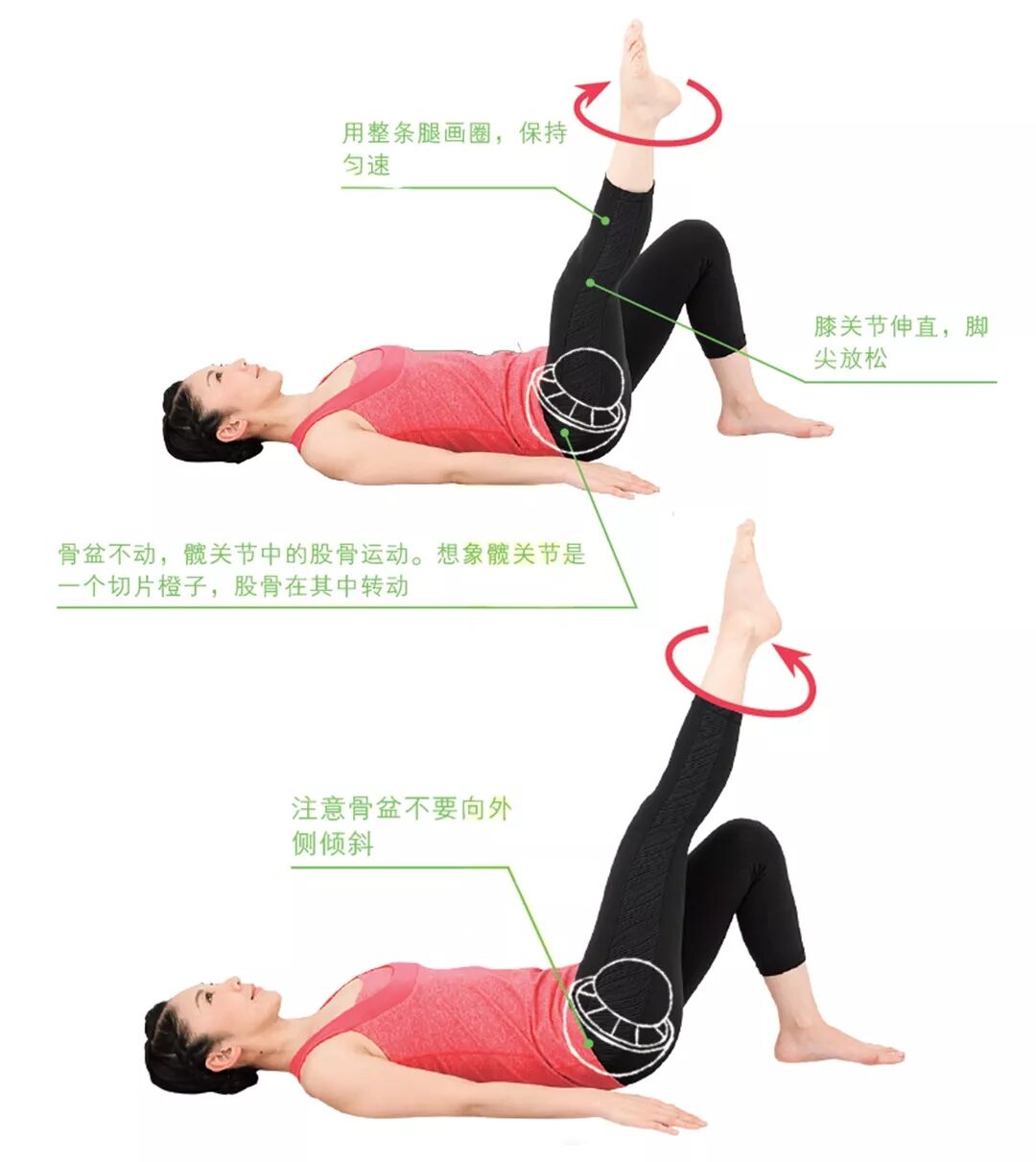 4.呼气,腿部向内侧转动。呼气的同时,腿部向内侧转动2~5圈,慢慢回落至步骤1的位置。