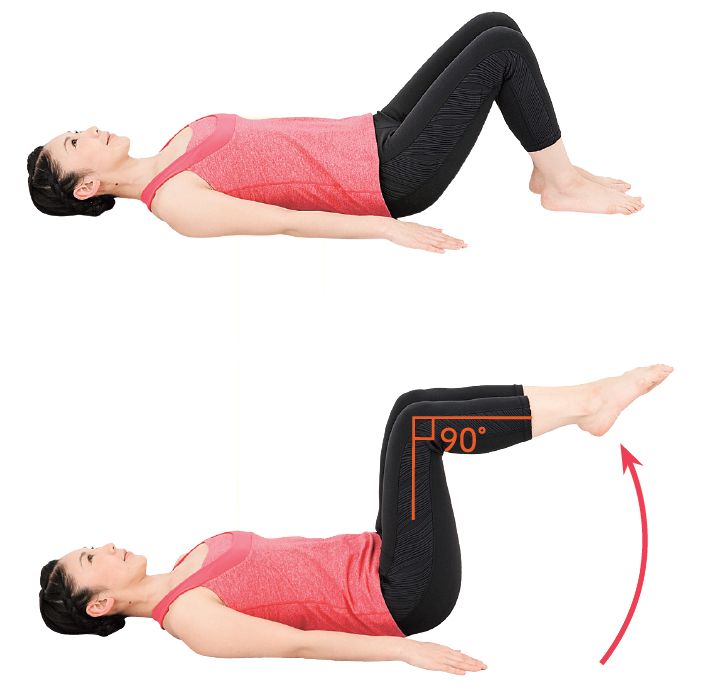2.呼气,双腿分别抬起。呼气的同时,双腿分别抬起。双腿并拢,膝关节弯曲呈90度角,吸气。