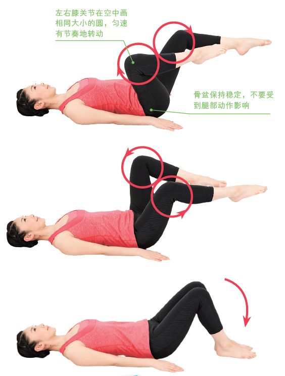 4.呼气,同步骤3类似,膝关节向左转动。腿部保持悬空状态,呼气的同时,膝关节向左逆时针转动画8 字形,转动2 ~ 5 圈后,吸气。