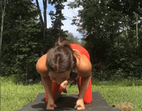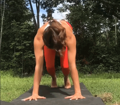 双手撑地,抬起膝盖来到下犬